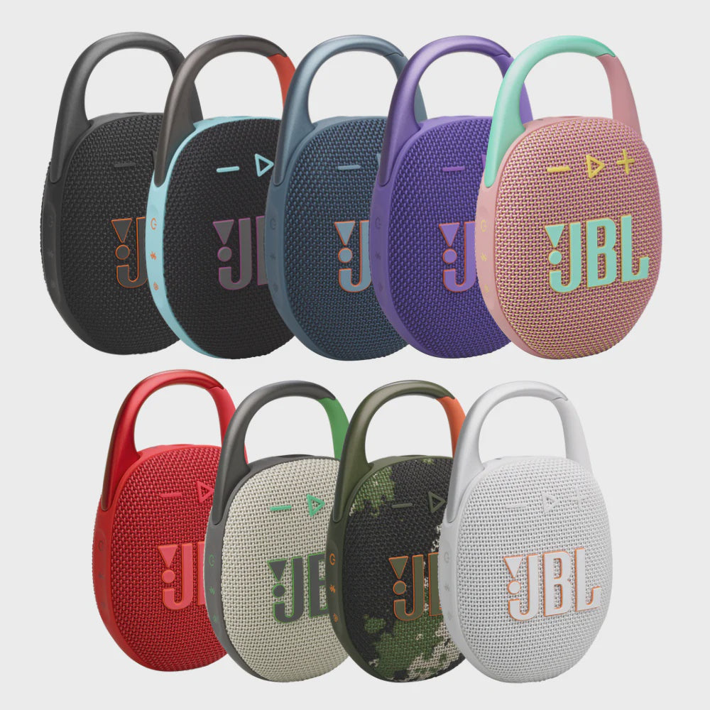 The JBL Clip 5 is a compact, ultra-portable Bluetooth speaker with big sound and bold style. Featuring a built-in carabiner clip, it's perfect for on-the-go listening—whether you're hiking, biking, or chilling at the beach. With improved battery life and JBL Original Pro Sound, the Clip 5 is your perfect adventure companion.